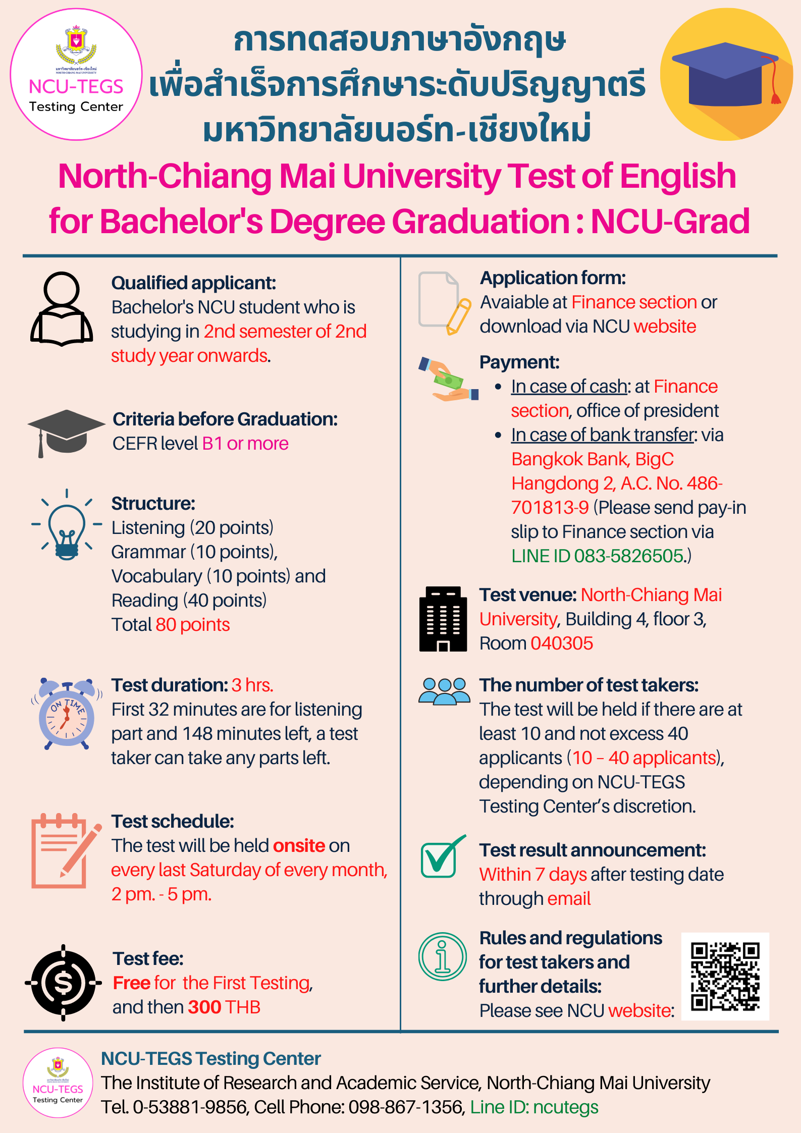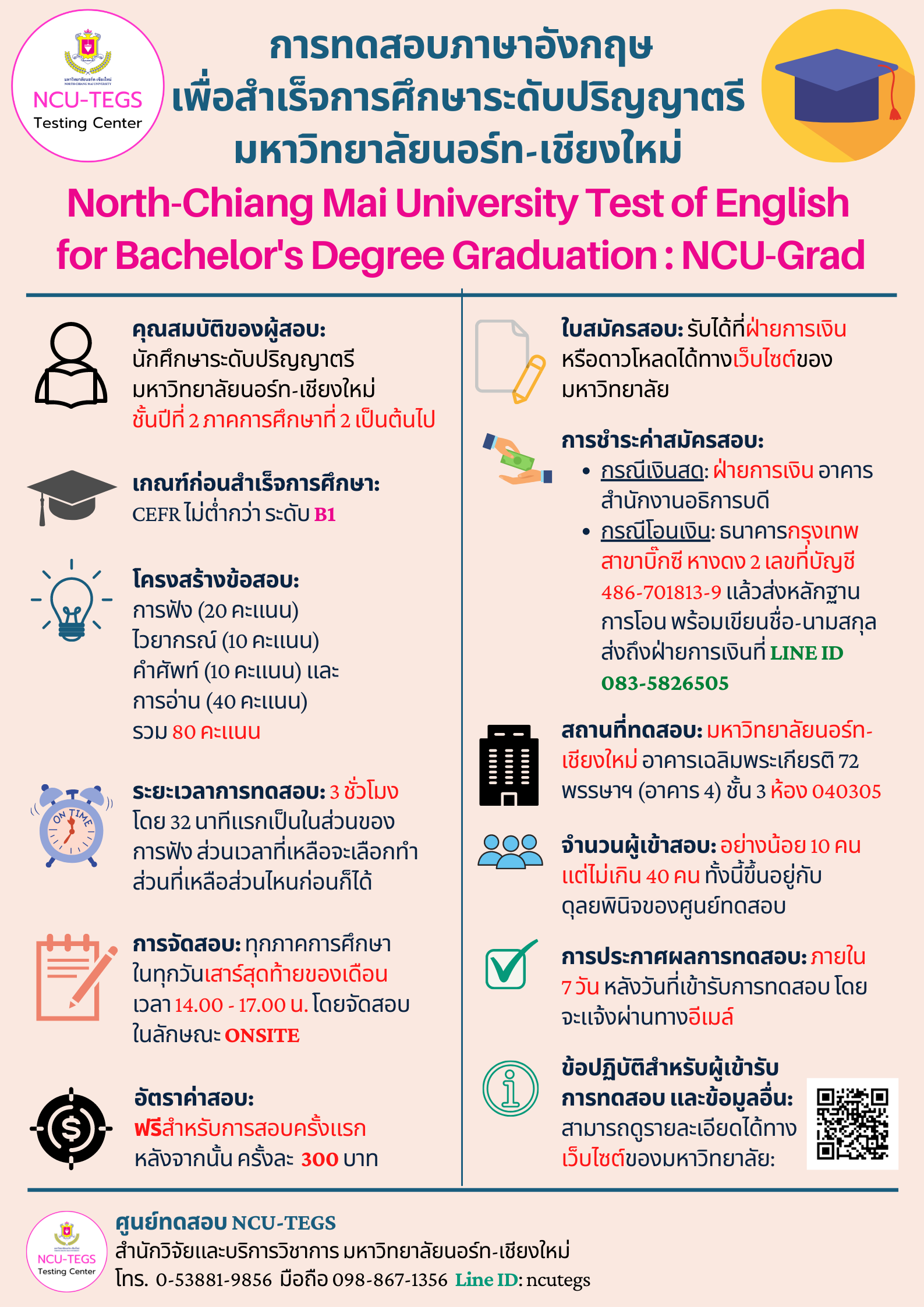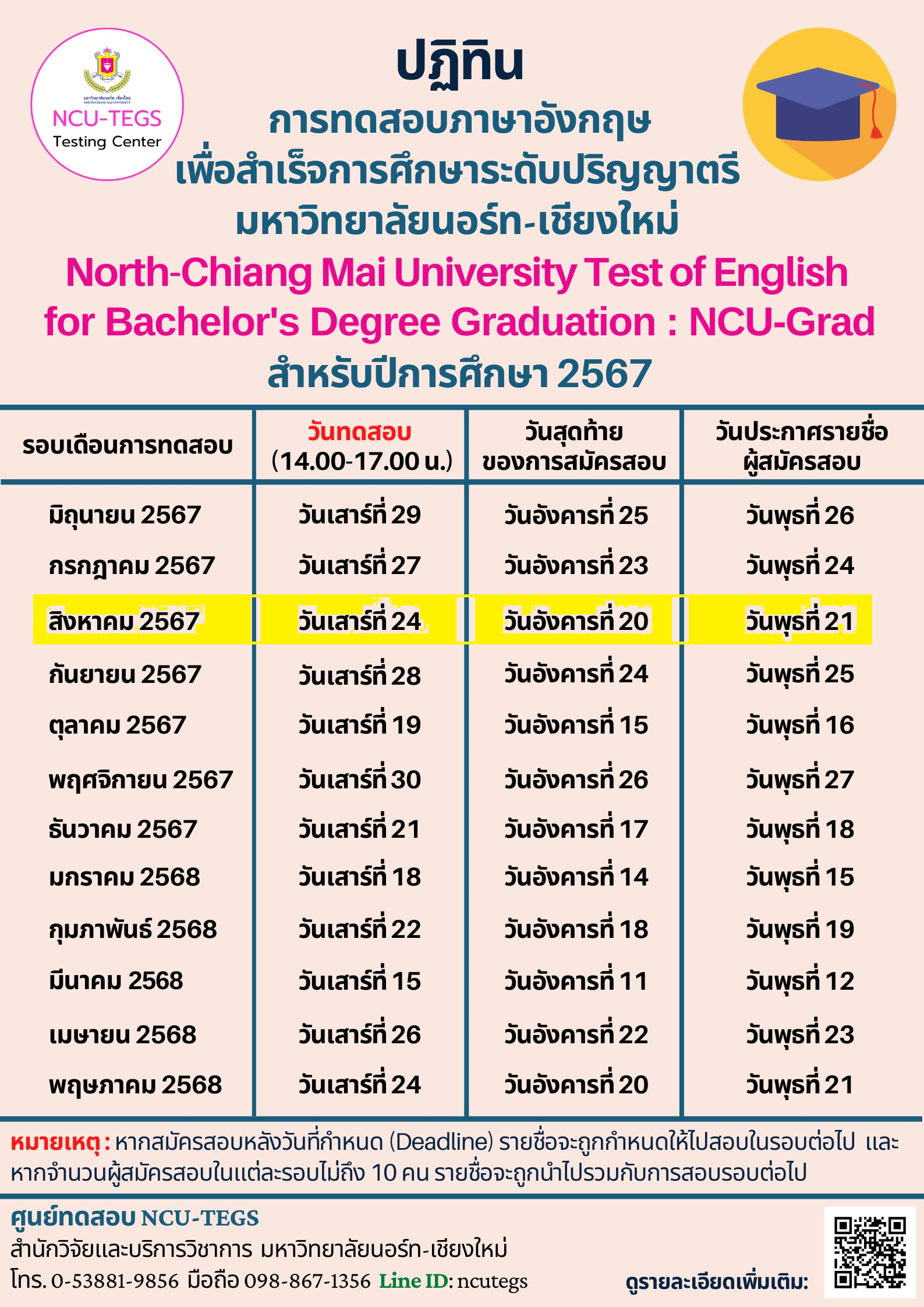 หน้าแรก >> ปฏิทิน การทดสอบภาษาอังกฤษเพื่อสำเร็จการศึกษ สำหรับนักศึกษาระดับปริญญาตรี มหาวิทยาลัยนอร์ท-เชียงใหม่ สำหรับเดือนสิงหาคม 2567